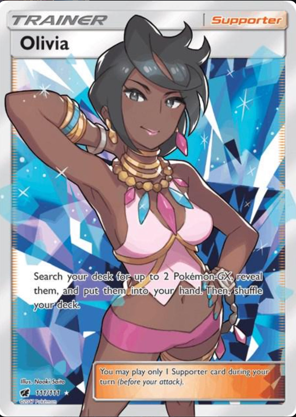 Bring island attitude to your deck with the stunning Olivia Full Art Trainer from Hidden Fates!